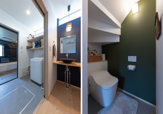 5.造作洗面台…シンプルで和の雰囲気に。土間と同じ照明を採用。