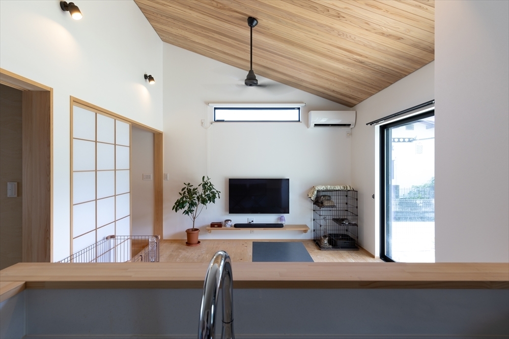 ご夫婦がワンちゃん、猫ちゃんと暮らす平屋です。ひのきの床は肌ざわりがよく、ワンちゃんたちも床にそのまま寝転ぶことが多いとのこと。和室とつながるLDKは、あえて収納を必要な分だけに抑え、ゆったりくつろげる空間を確保しました。