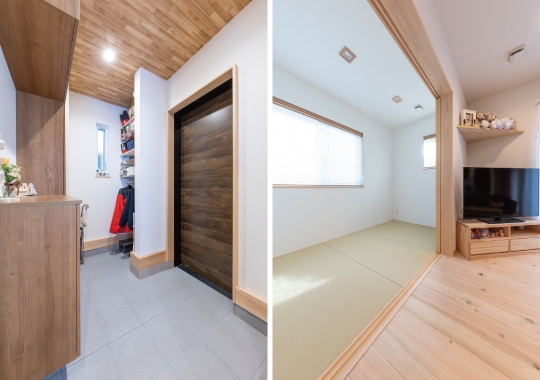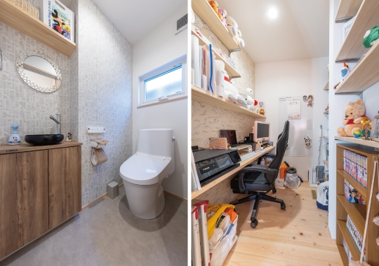外壁やクロスにはご家族の“好き” を取り入れつつ、間取りは暮らしやすさを大切にしたシンプルな住まいです。全館空調システムを採用し、夏も冬も家中の温度差が少なく、快適な毎日を過ごされています。