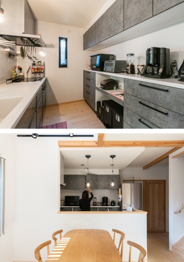 キッチンで料理をしている奥様、吹き抜けで室内干しをしているご主人、テレビを見ているお子様、小上がりで眠っている赤ちゃん。別々の場所にいても空間が一体となっているので、安心して家事をすることが出来ます。